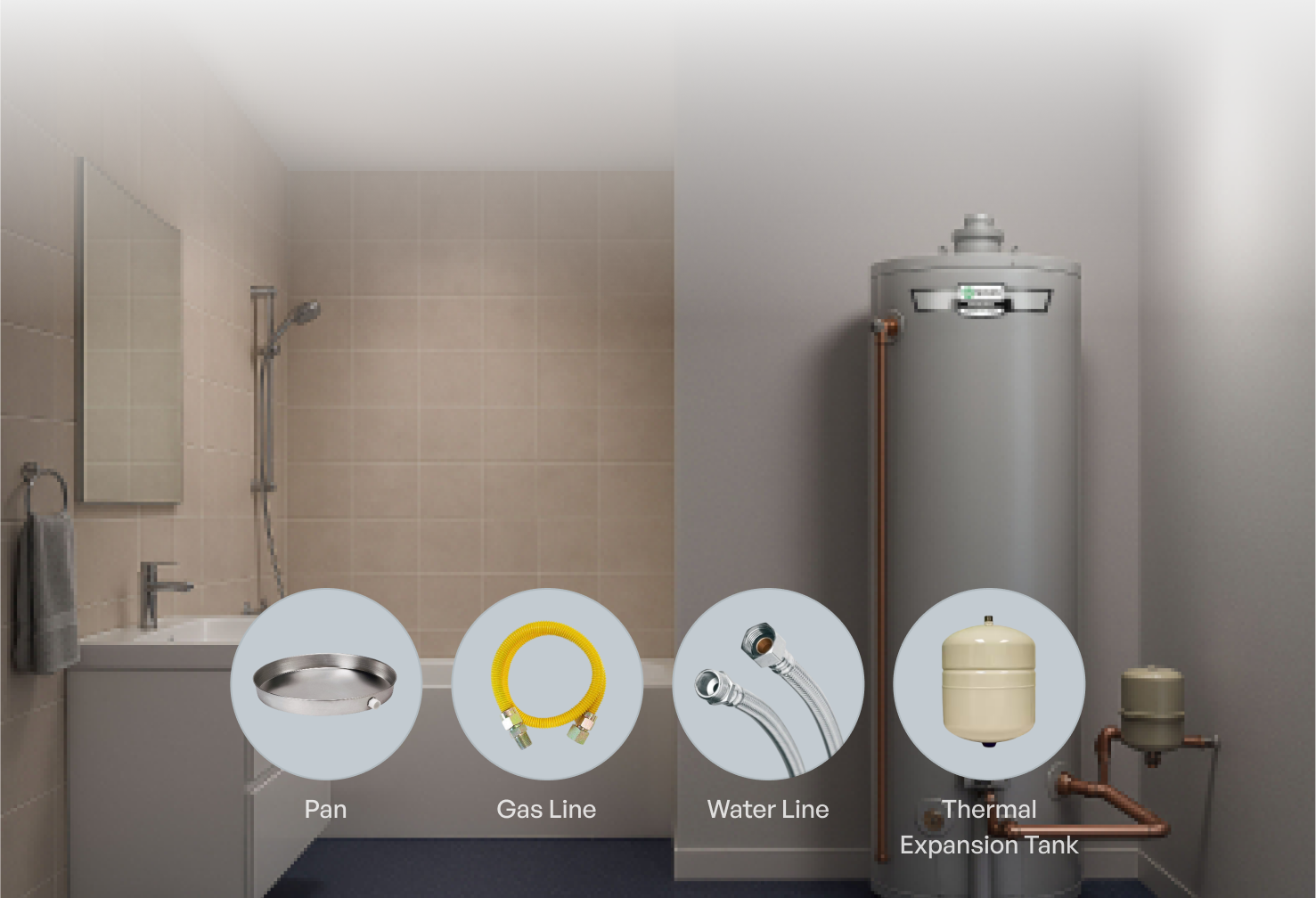 Includes new pan, gas line, water lines, and thermal expansion tank.